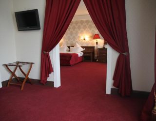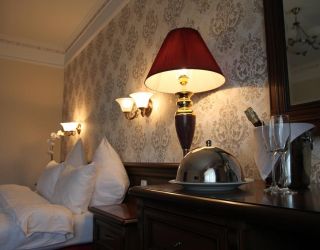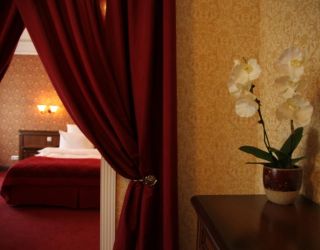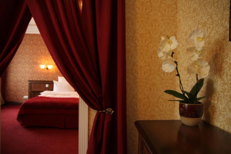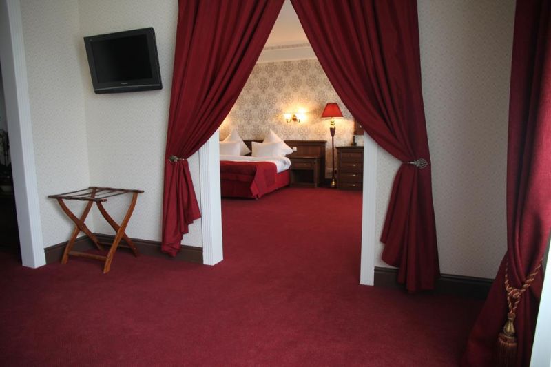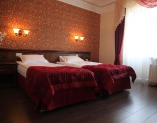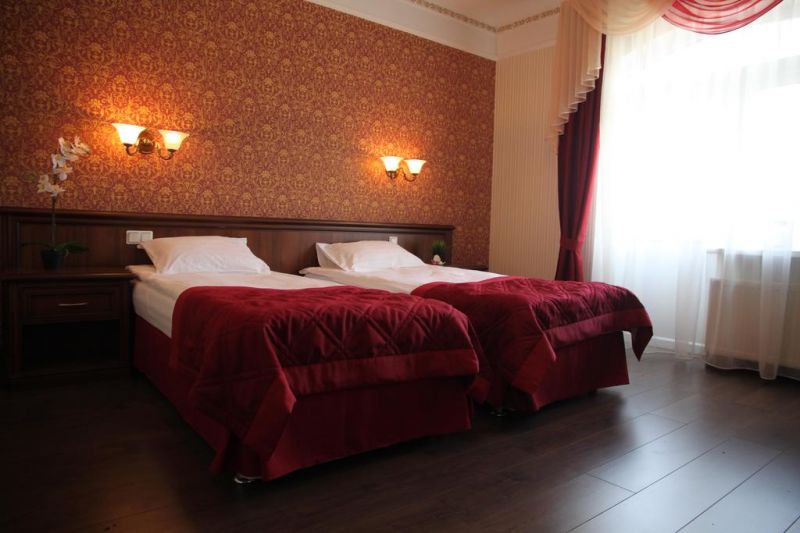 Двухэтажное здание отеля, рассчитанное на размещение 100 человек, состоит из комфортабельных номеров категории Стандарт, Улучшенный и Люкс. Номера, в оформлении которых прослеживается все та же концепция усадебного быта, укомплектованы роскошным мебельным гарнитуром, бытовой техникой, оснащены санузлом с душевой кабиной, в некоторых номерах имеется джакузи.